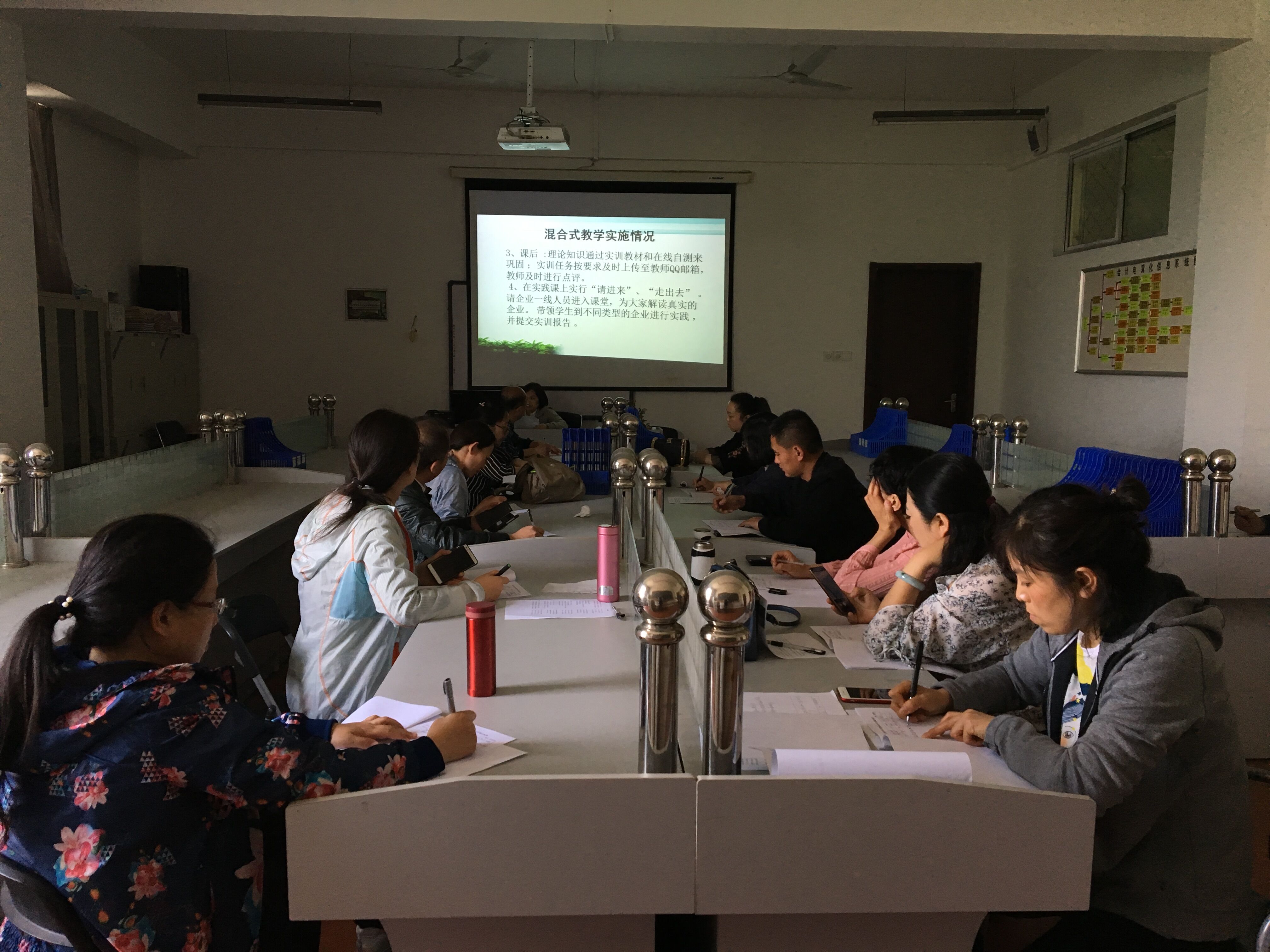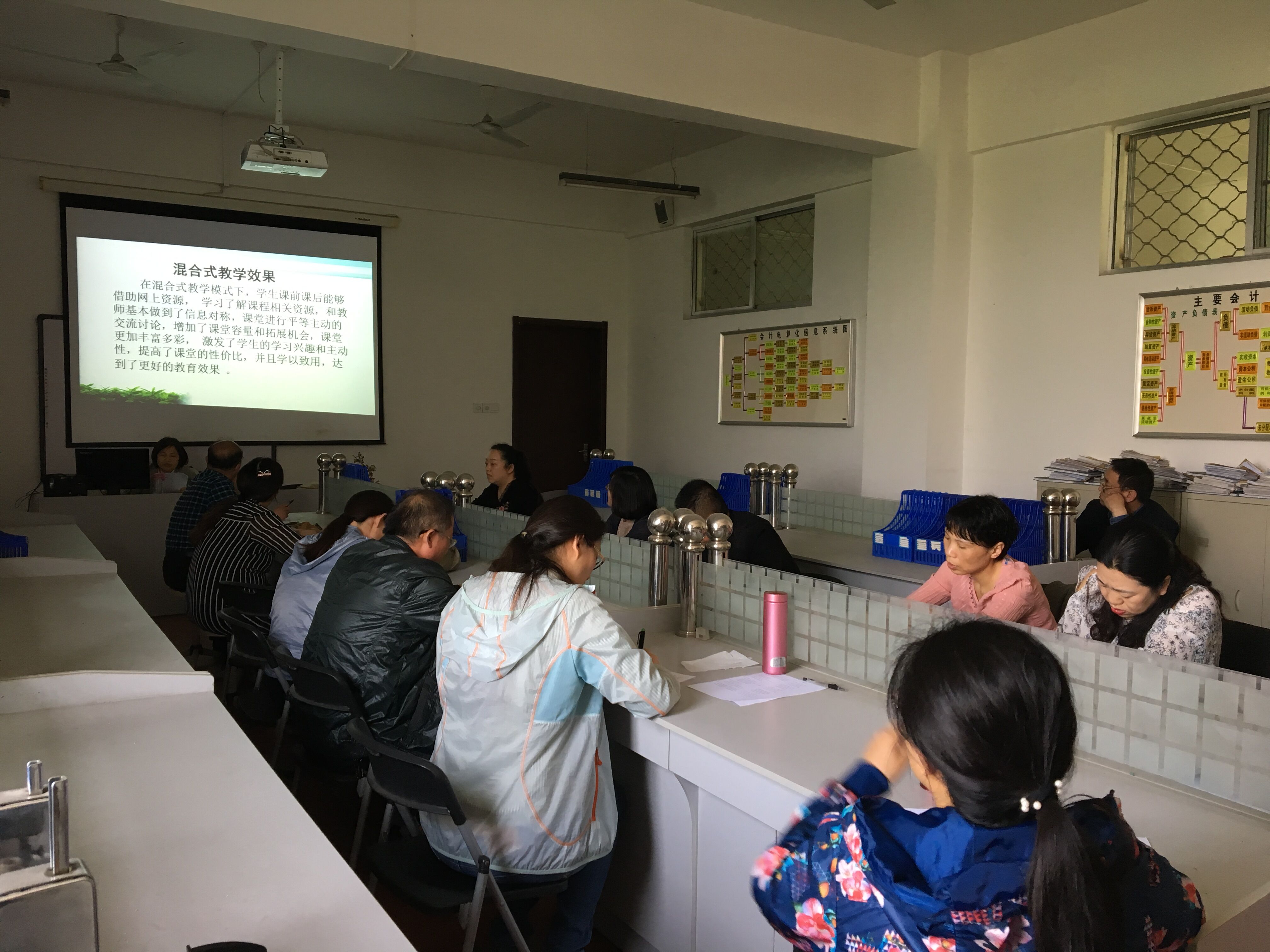 2018年4月28日下午,經(jīng)貿(mào)學(xué)院舉行了混合式教學(xué)模式專題教研活動,主要由我院杜艷卿老師介紹混合式教學(xué)模式的設(shè)計理念和實施過程,結(jié)合實際教學(xué)說明線上線下科學(xué)合理的融合,以及由此帶來的顯著教學(xué)效果。采用混合式教學(xué)模式,教師要在課前將基礎(chǔ)性的知識和比較容易的知識點放在網(wǎng)絡(luò)上讓學(xué)生提前自學(xué),主要應(yīng)用的網(wǎng)絡(luò)資源為江蘇城市職業(yè)學(xué)院學(xué)習(xí)平臺,教師自建的QQ群、微信群。在課堂上將需要實踐的理論知識和較難的知識點進行講授與實訓(xùn),教師每節(jié)課的內(nèi)容設(shè)計采用能吸引學(xué)生、豐富多彩的教學(xué)形式,深受學(xué)生的喜愛和好評。